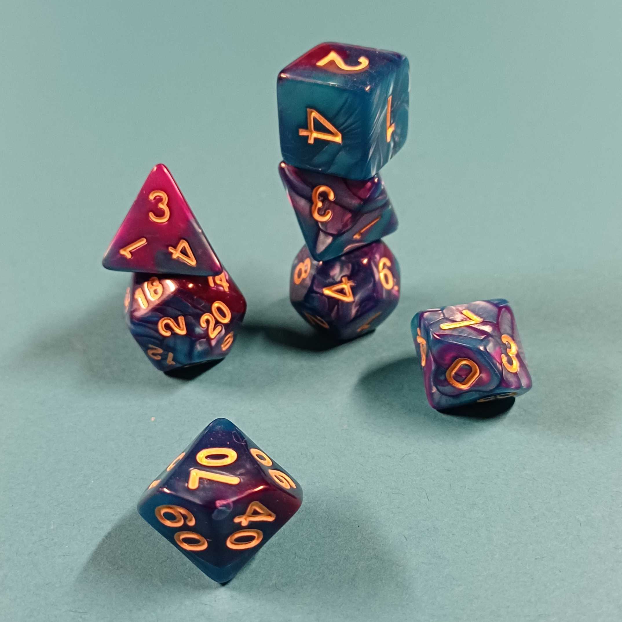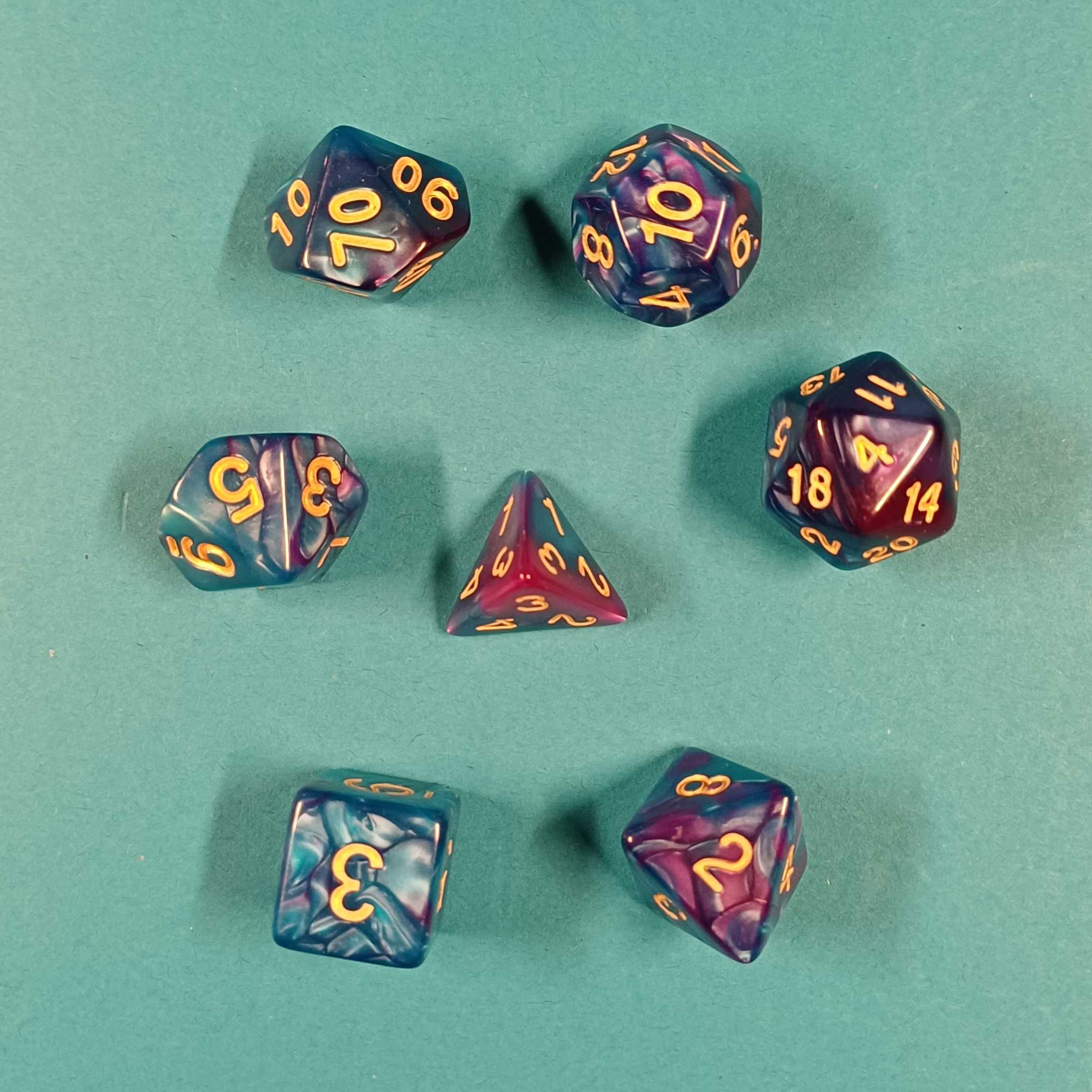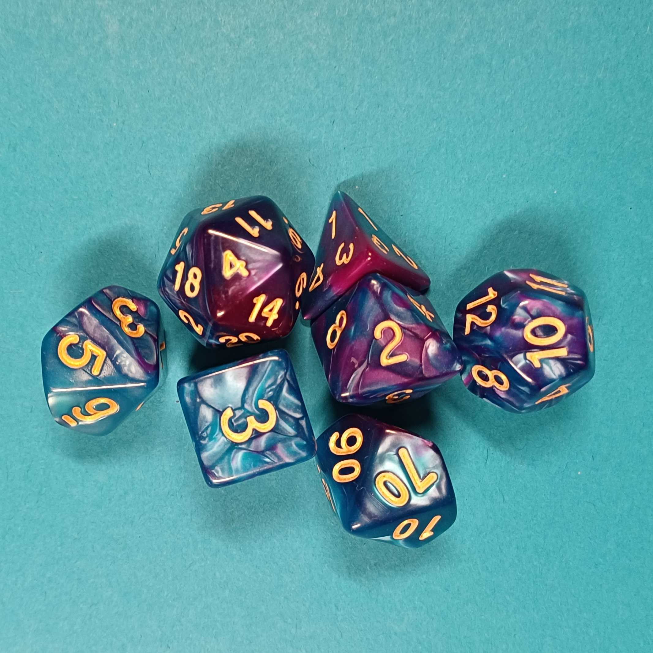 Elegantes 7er Würfelset in Petrol und Violett mit marmorierter Optik und goldenen Zahlen – ideal für Rollenspiele und Sammler.