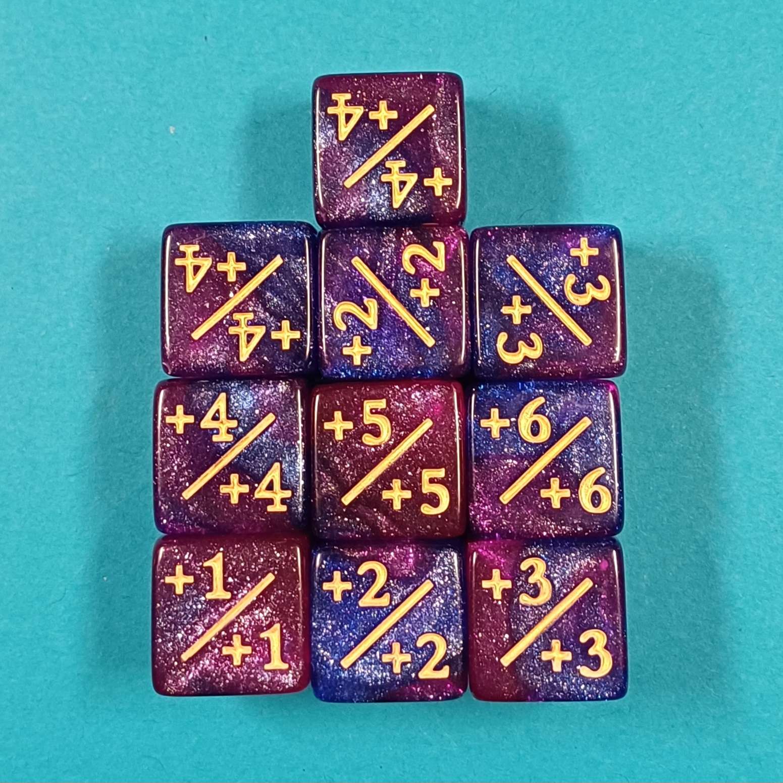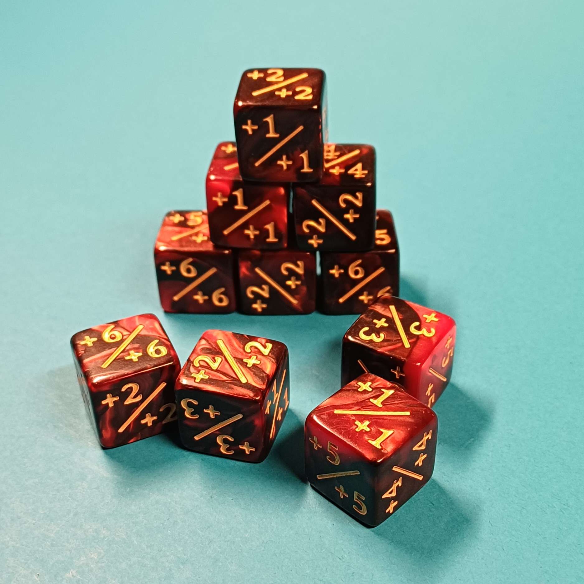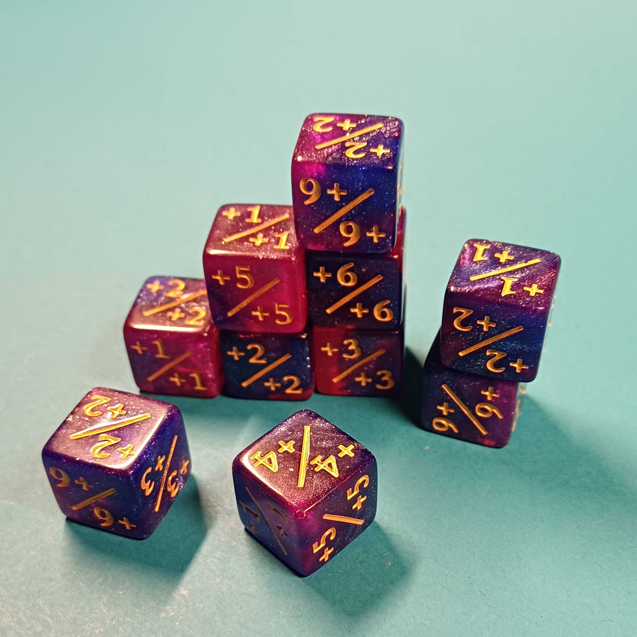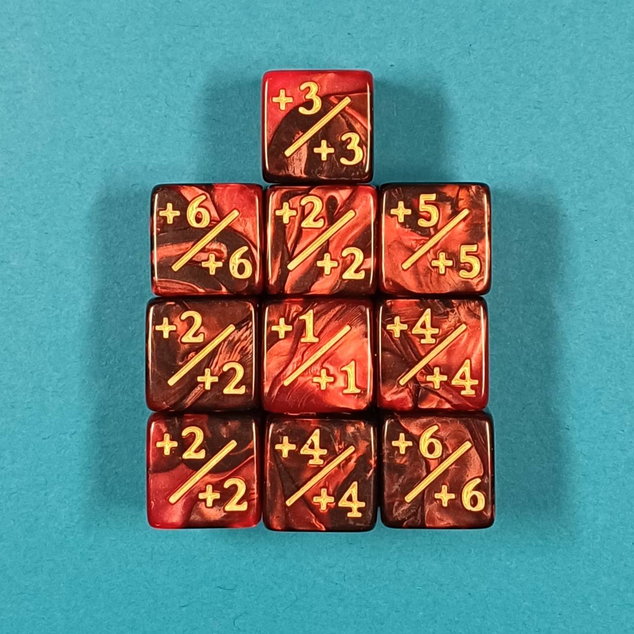 10 Würfel (ca. 16 mm) mit Modifikatoren von +1 bis +6