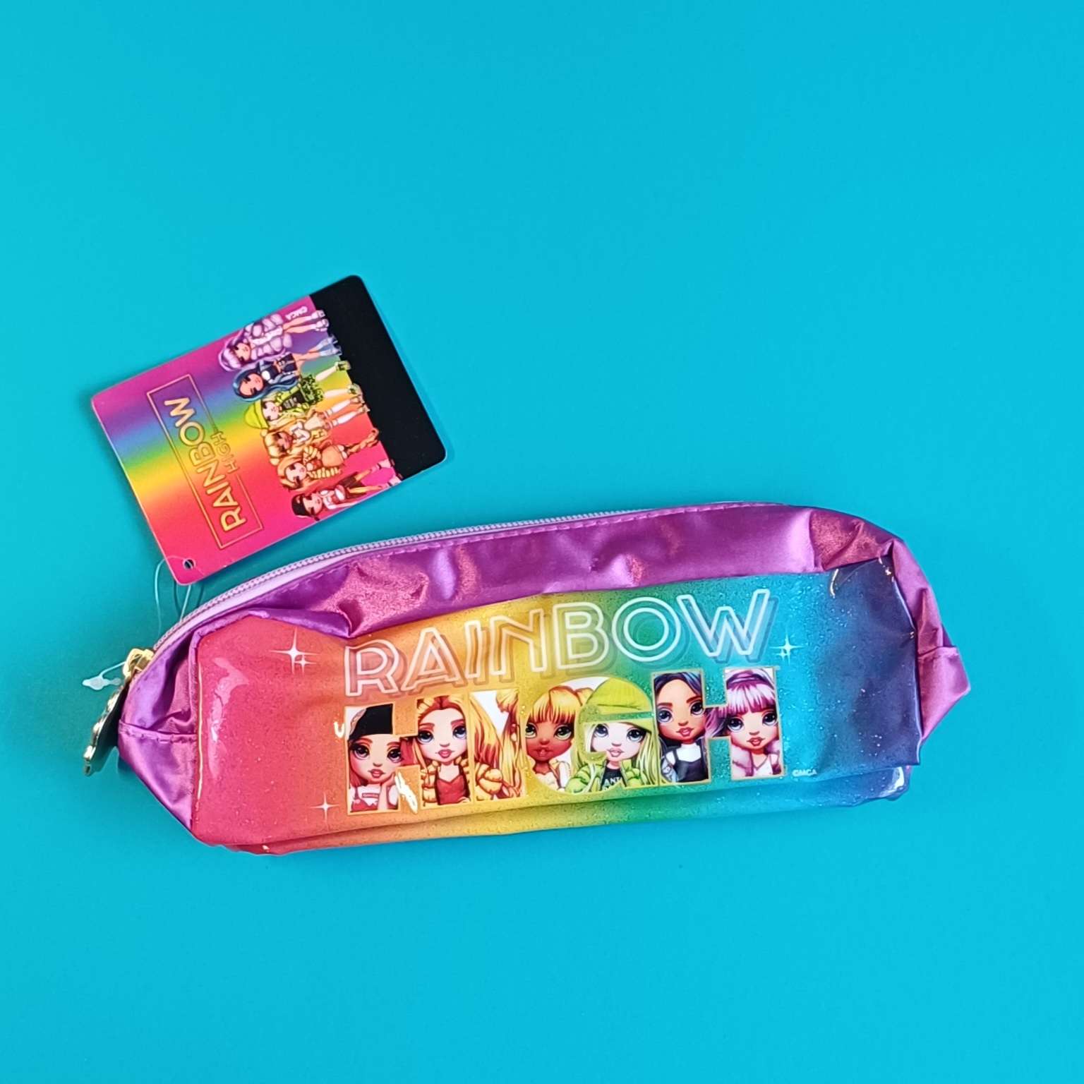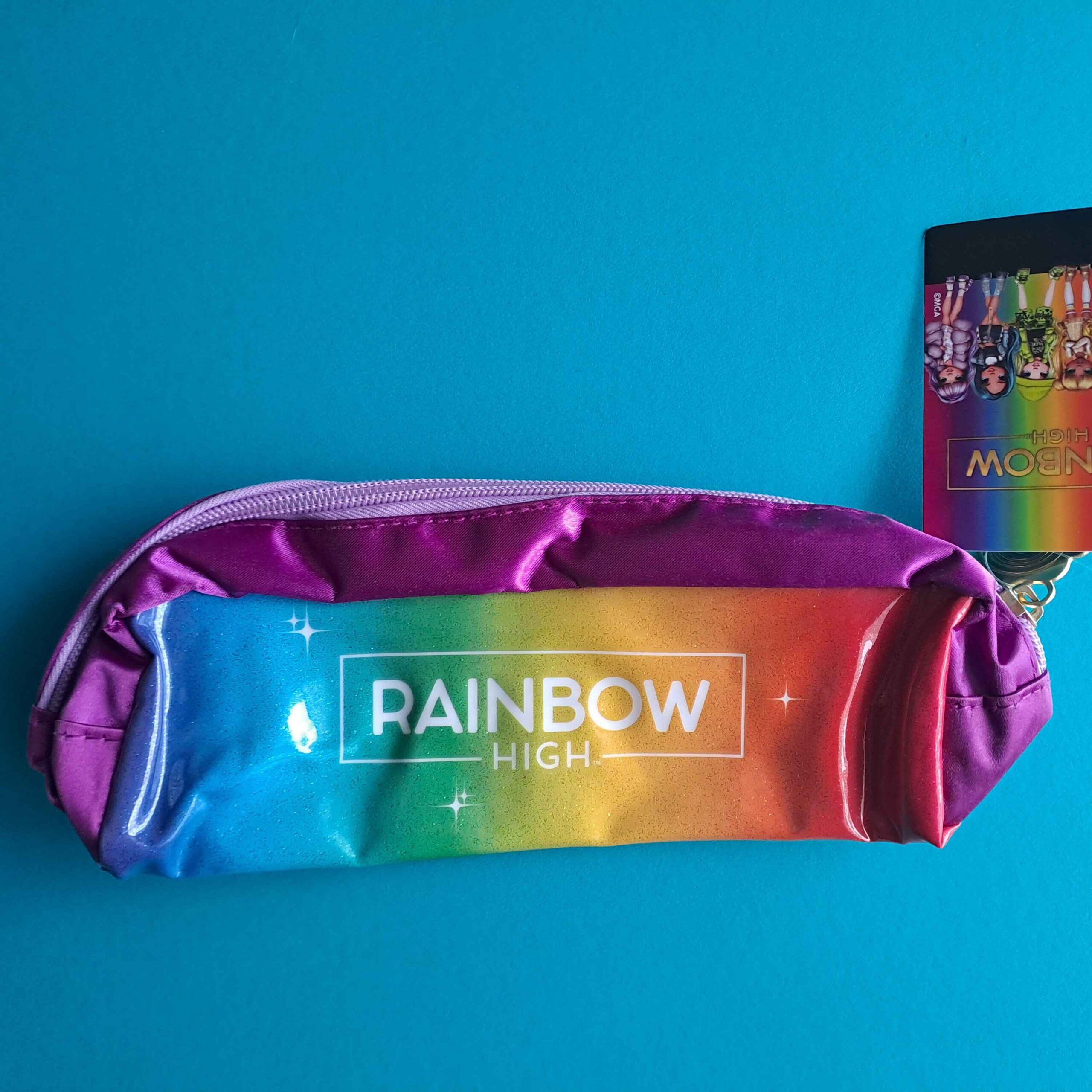 Farbenfrohes Mäppchen im glänzenden Rainbow-Design mit Motivdruck. Praktisch für Schule, Freizeit oder unterwegs – ideal zur Aufbewahrung von Stiften, kleinen Accessoires und mehr.