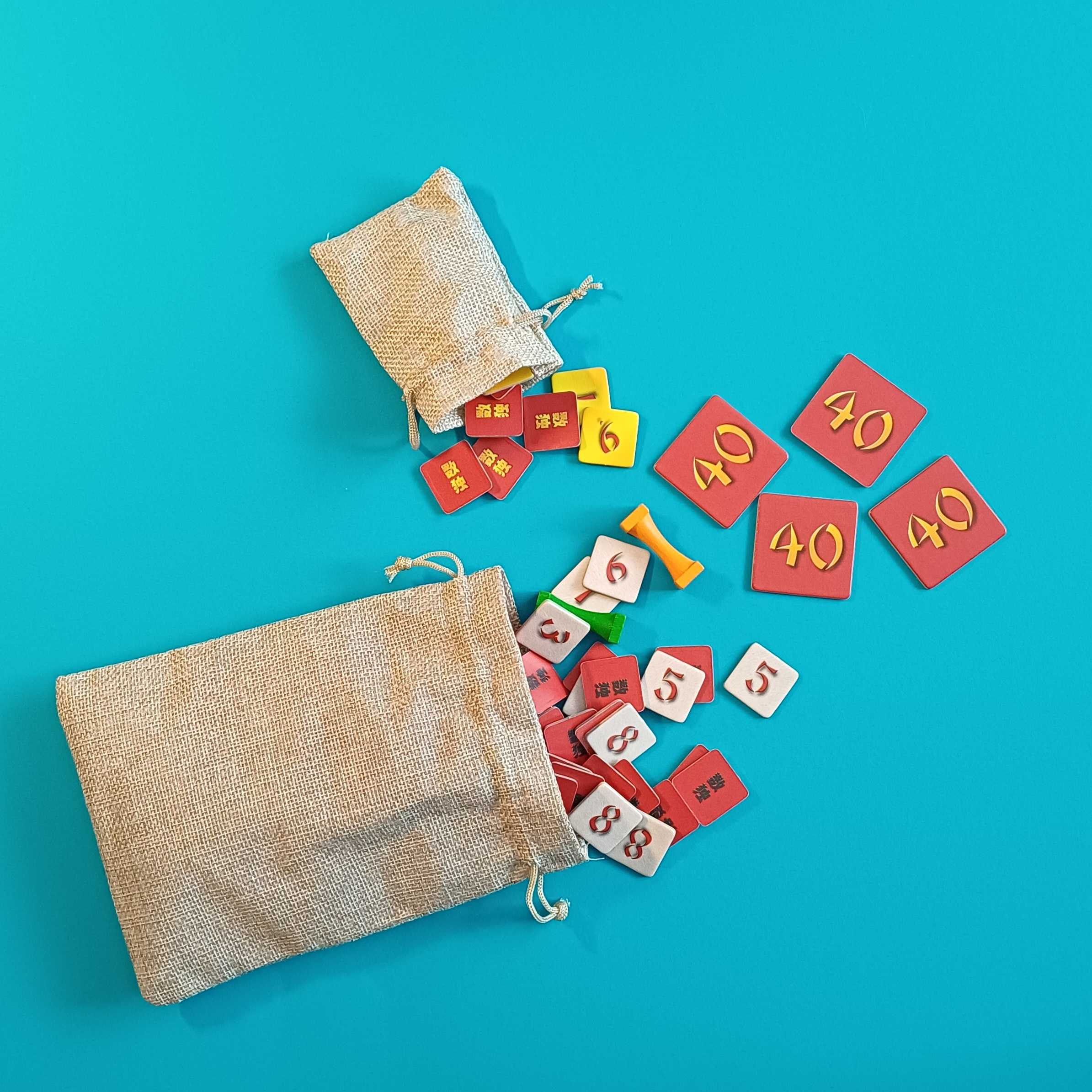 Das Spiel ist vollständig. Das Spielmaterial befindet sich in sehr gutem Zustand. Drei Jutebeutel zur besseren Aufbewahrung wurden ergänzt. Die Schachtel weist Gebrauchsspuren auf.